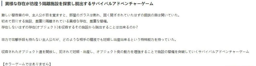 开放被收容的オブジェクト们,被侵犯后怀孕、生子,借此以增强オブジェクト方面的势力来突破设施警备的生存冒险游戏。