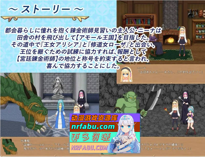 主人公妮娜,是一位憧憬着都市生活的炼金术士见习生。她离开了乡下的村庄,前往[阿摩尔王国]。在那里,她遇到了『亚莉希亚公主』和『侍女罗莎』。她们告诉妮娜,如果她能协助公主继承王位所面临的试炼,作为回报,将承诺她[宫廷炼金术士]的地位和称号。妮娜欣然答应了合作。